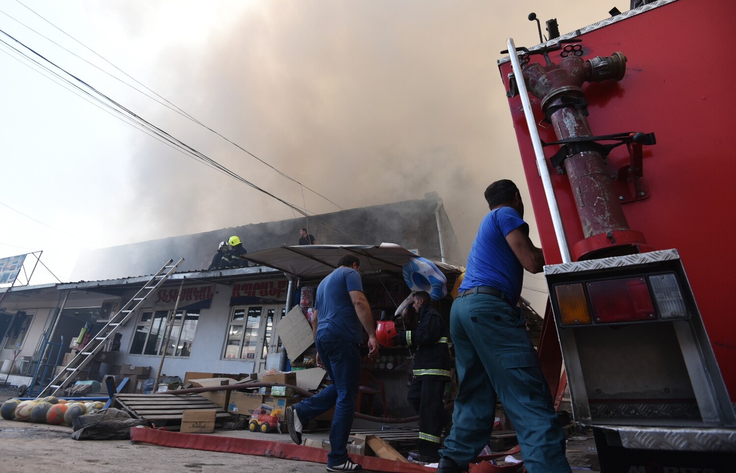 Момент взрыва попал на видео, на котором видно, как здание рынка окутывает черный дым, люди начинают бежать и затем слышны взрывы.