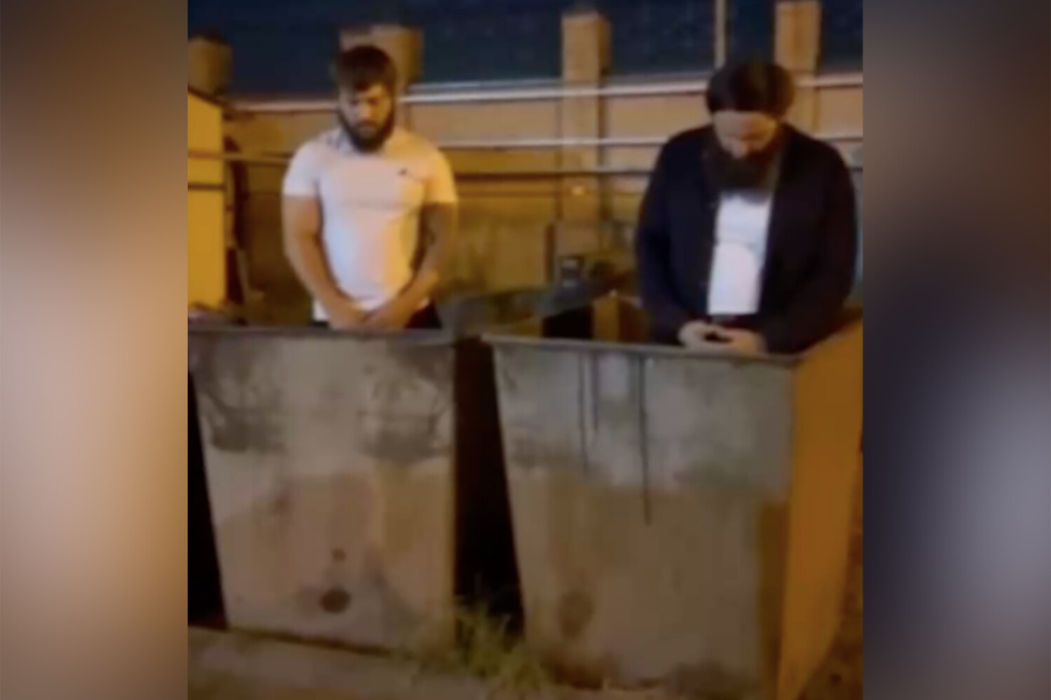 Двое чеченцев, стоя в мусорных баках, извинились на камеру за издевательства над мужчиной с особенностями развития. Кадры опубликовал Telegram-канал Mash Gor.