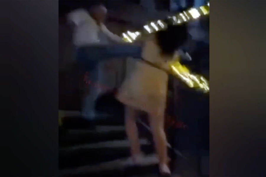 На кадрах видно, как женщина поднимается по лестнице, между ней и стоящим сверху мужчиной происходит словесная перепалка, и он два раза ударяет ее по голове ногами. Пострадавшей помогают свидетели происшествия. Слышны крики: «Вызывайте полицию».
