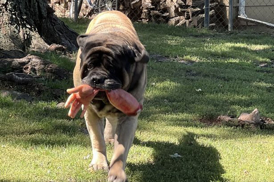 Английский мастиф по кличке Татанка, который весит около 100 кг, нес в зубах декорацию к Хэллоуину. Как пояснила хозяйка, ее собака наводит страх на местных жителей из-за своих размеров, а когда они увидели конечность, то посчитали, что пес съел почтальона