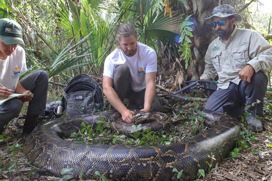 В ходе поисковых работ полицейские обнаружили огромного семиметрового питона с раздувшимся животом. Правоохранители вспороли живот змеи и обнаружили там тело погибшей женщины.