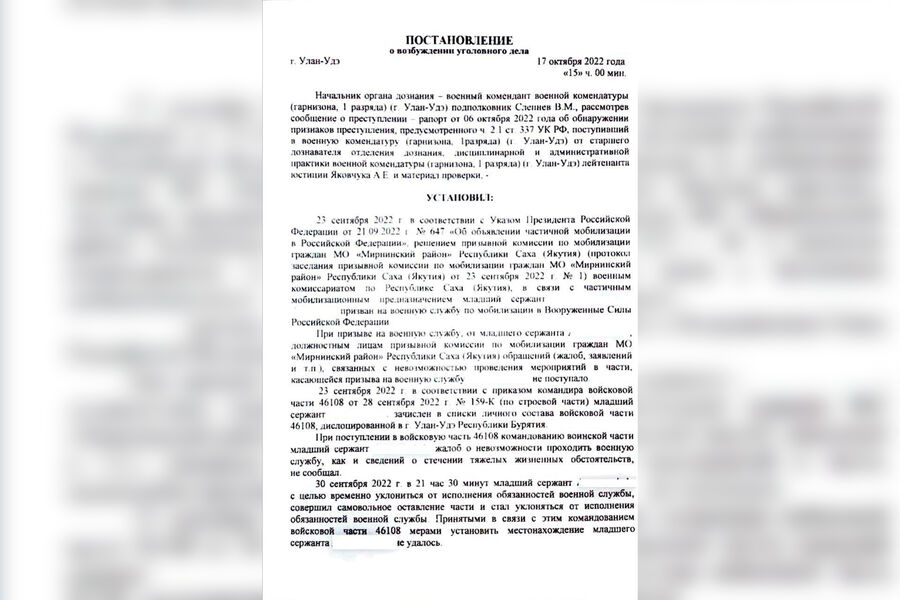В Улан-Удэ военный комендант возбудил уголовное дело в отношении мобилизованного жителя Якутии, который самовольно покинул войсковую часть в Бурятии после прибытия из военного комиссариата. Об этом сообщил правозащитник Павел Чиков в своем Telegram-канале.
