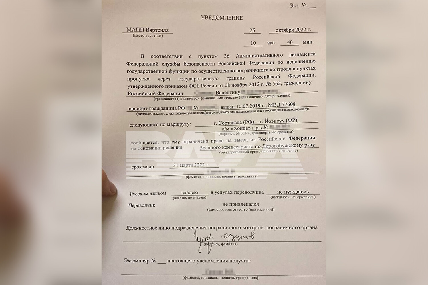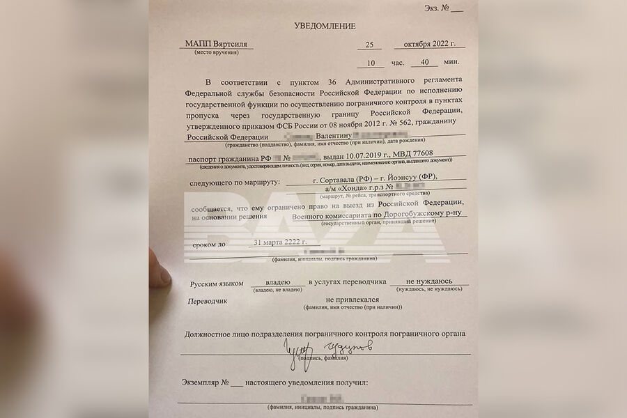 При попытке выбраться за границу через российскую Сортавалу он получил уведомление о том, что военкомат Смоленской области запретил ему выезжать из страны до 31 марта 2222 года.