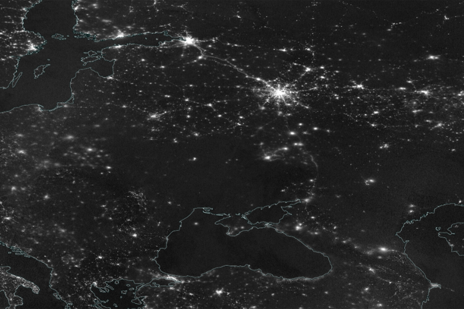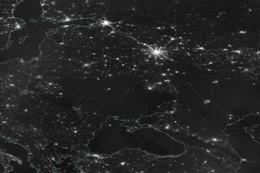 На фото, которое было сделано 17 декабря видно, что Украина остается в полной темноте на фоне ярких пятен света городов и инфраструктуры соседних стран.