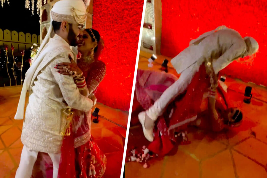 Молодожены из Индии развеселили соцсети, упав во время исполнения свадебного танца, пишет NDTV. Cами супруги, несмотря на конфуз, тоже отнеслись к ситуации с юмором.