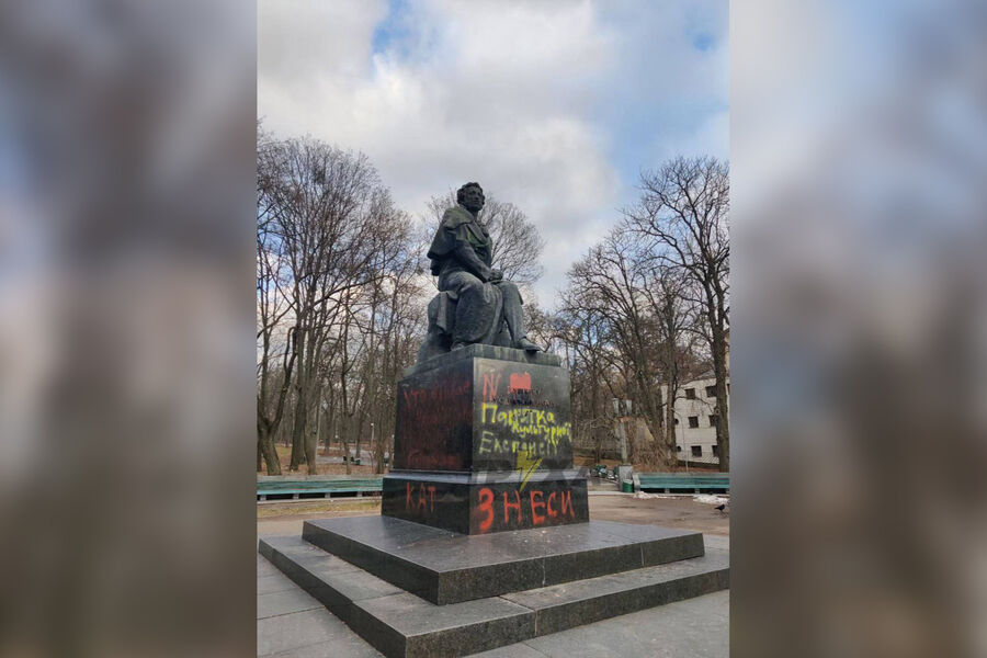 Постамент памятника, расположенного в парке Пушкина на Шулявке, оказался осквернен надписями красного и желтого цвета: «Снеси», «Памятник культурной экспансии» и «Палач».