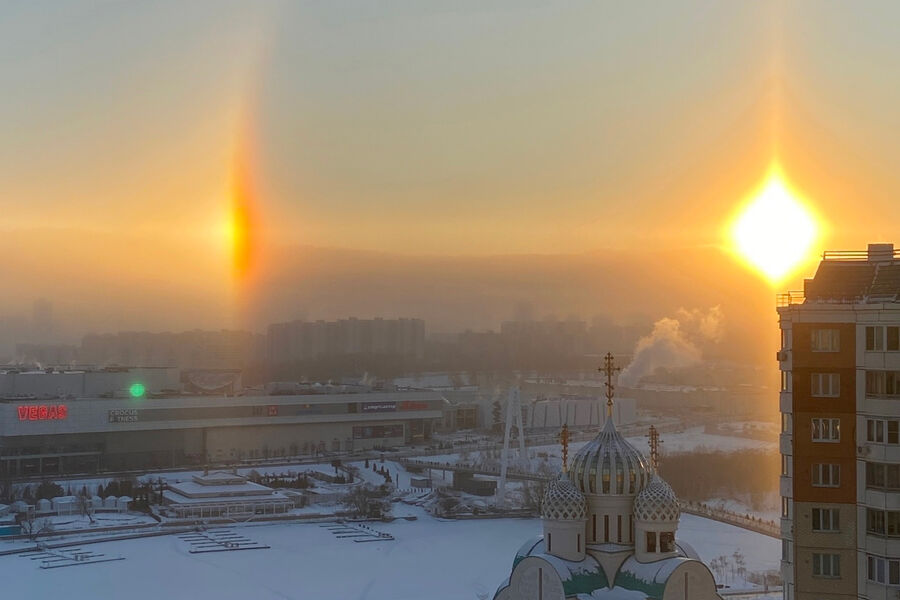 В небе над столицей утром 6 января словно появились два светила. Очевидцы также успели запечатлеть несколько солнечных столбов, исходящих из-под земли.