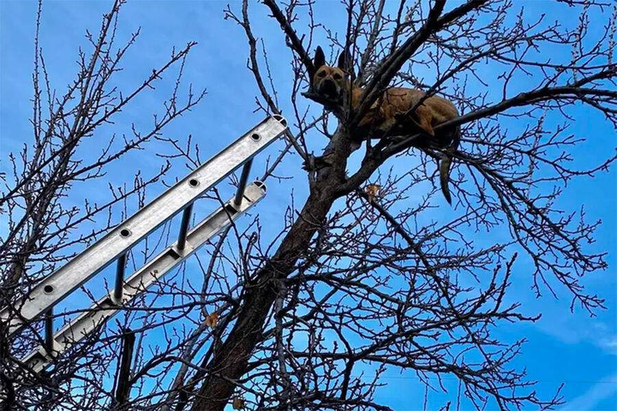 Собака застряла на дереве после неудачной погони за белкой