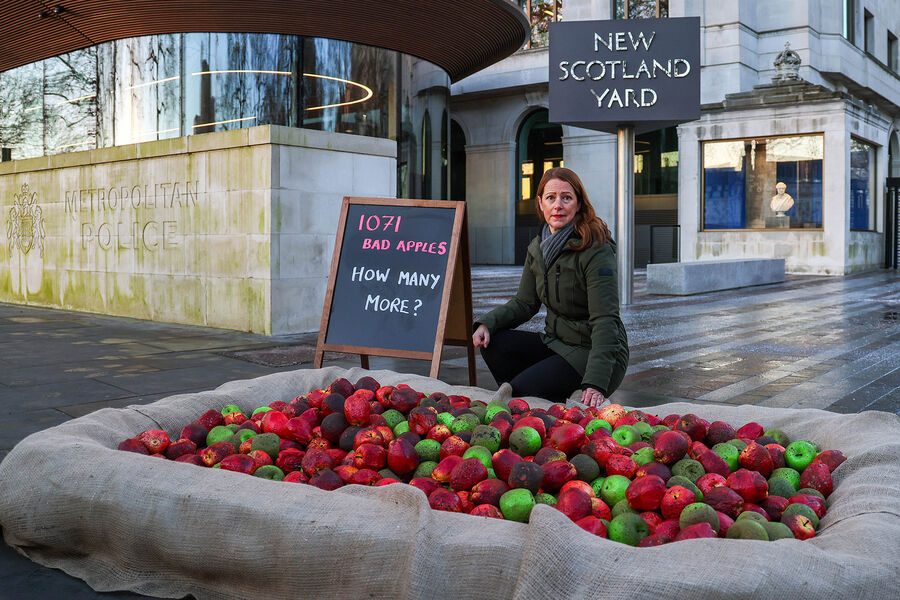 Как отмечает телеканал, на фоне здания штаб-квартиры Скотленд-Ярда было выставлено 1071 гнилое яблоко, это количество отражает число сотрудников лондонской полиции, которые были или в данный момент находятся под следствием по обвинению в насилии.
