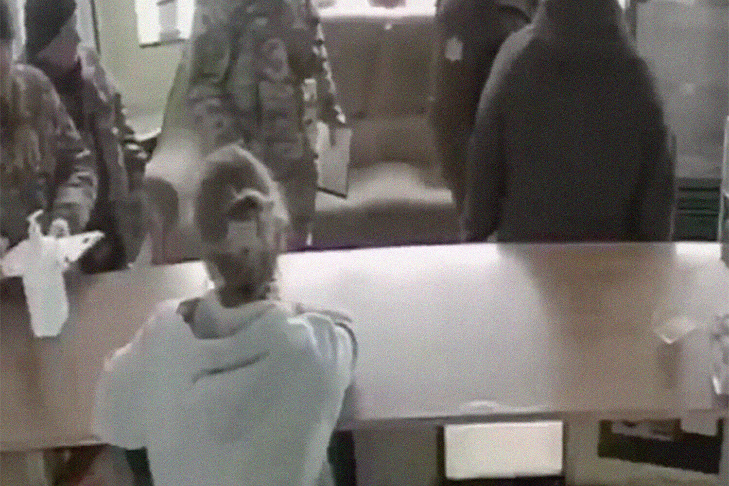 Издание опубликовало видео, на котором несколько человек в камуфляже поговорили с девушкой за стойкой, очевидно, администратором, и затем прошли внутрь, «чтобы вручить повестки тем, кто там занимался».