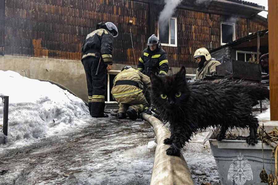 На фото, сделанном во время пожара в частном доме Новокузнецка, в кадр попал кот. В МЧС Кузбасс сообщили, что он «помогал» в тушении огня.