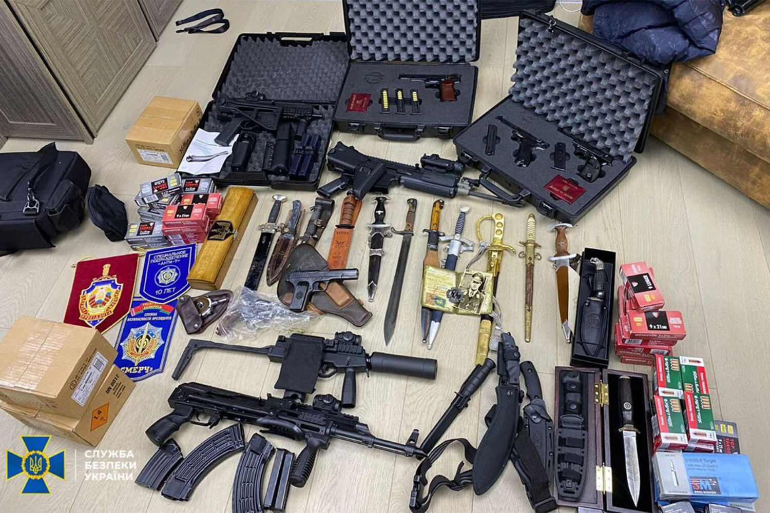 Кроме того, сотрудники СБУ во время обыска изъяли 13 единиц оружия, в том числе более 5,6 тыс. патронов, мобильные телефоны, компьютеры и документы.