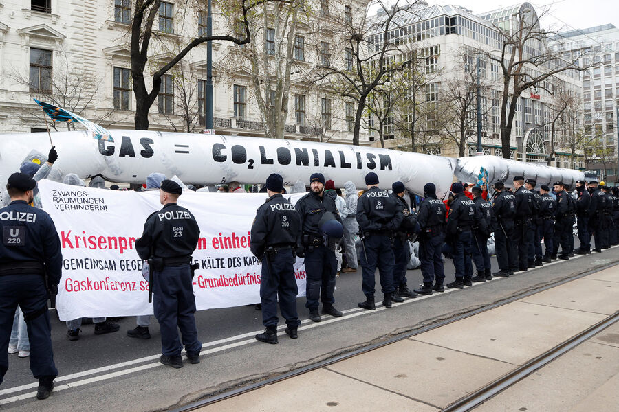 Несмотря на дождь и холодную погоду, экоактивисты устроили сидячую демонстрацию на одной из улиц, выкрикивая лозунги: «Вы всего лишь проплаченные государством хулиганы». Участники акции собрались в центре австрийской столицы с плакатами и огромной трубой, похожей на газовую, с надписями «Последняя зима газа» и «Газ — это колониализм». Протестующие предпринимают попытки продвинуться к месту проведения мероприятия.