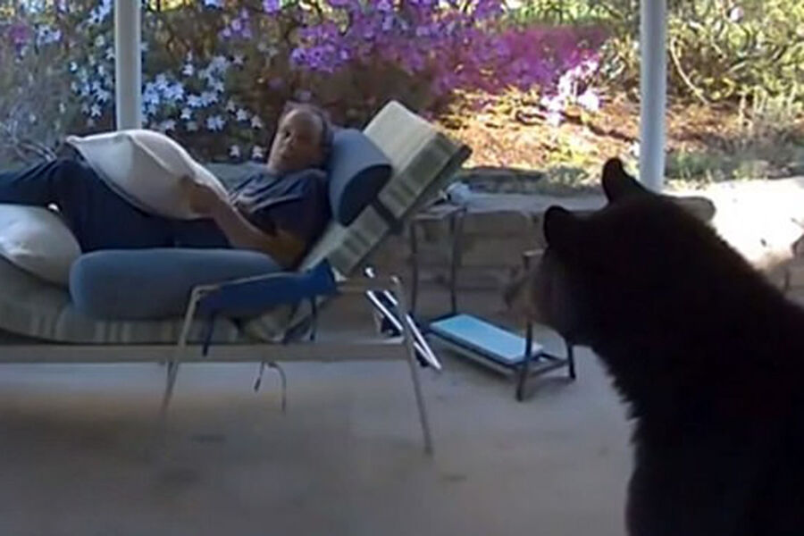 Дэвид Оппенгеймер лежал во дворе своего дома, когда к нему внезапно подкрался медведь. Мужчина, читавший книгу на телефоне, краем глаза заметил животное и испугался, застыв в одной позе. Впрочем, хищник, видимо, и сам не ожидал, что встретит человека, поэтому тоже застыл на одном месте, а спустя несколько секунд бросился наутек.