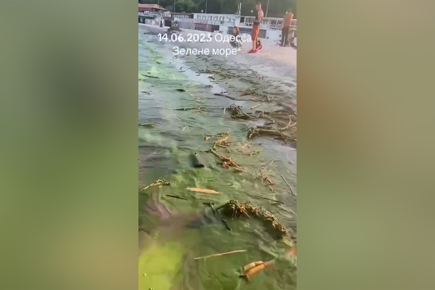 Очевидцы опубликовали видеозапись с пляжа в Одессе, где море стало зеленым после разрушения и прорыва воды с Каховской ГЭС, которое произошло 6 июня. Видео опубликовал местный Telegram-канал.