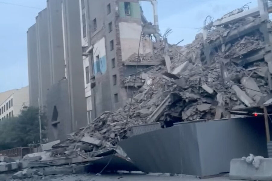 Очевидцы сняли происходящее на камеру мобильного телефона. На кадрах видно, что фрагменты здания повредили строительные ограждения.
