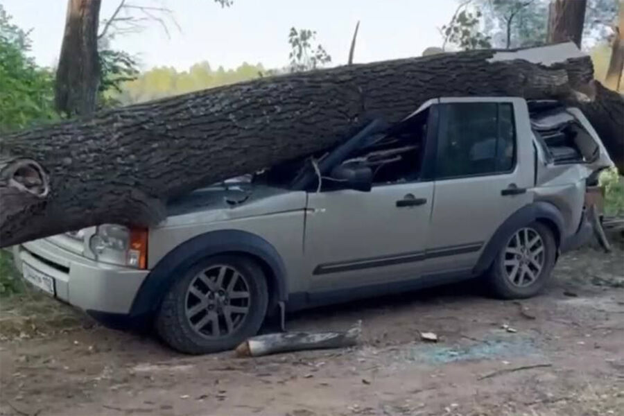 Упавшее дерево повредило также автомобиль: у него помята крыша и разбито лобовое стекло.