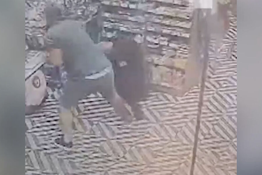 Избиение, как зафиксировала камера в супермаркете, продолжалось около минуты. В конце агрессор начинает душить охранника, пока на помощь тому не приходит один из продавцов — женщина что-то говорит покупателю, после чего он отпускает пострадавшего.