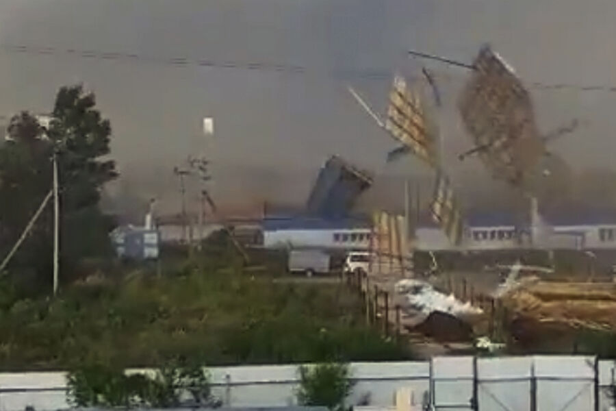 Уточняется, что в городе ветер срывает крыши зданий, переворачивает остановки и рвет провода.