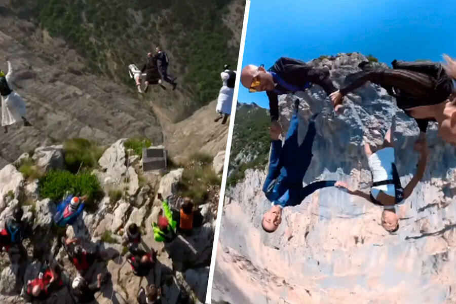 Кадры, на которых жених и невеста вместе с гостями свадьбы прыгают с парашютом с высокой скалы, разошлись по соцсетям. По данным СМИ, молодоженов зовут Присцилла Ант и Филиппо ЛеКуэрс, а все люди, присутствующие на церемонии бракосочетания были экипированы соответствующим образом.
