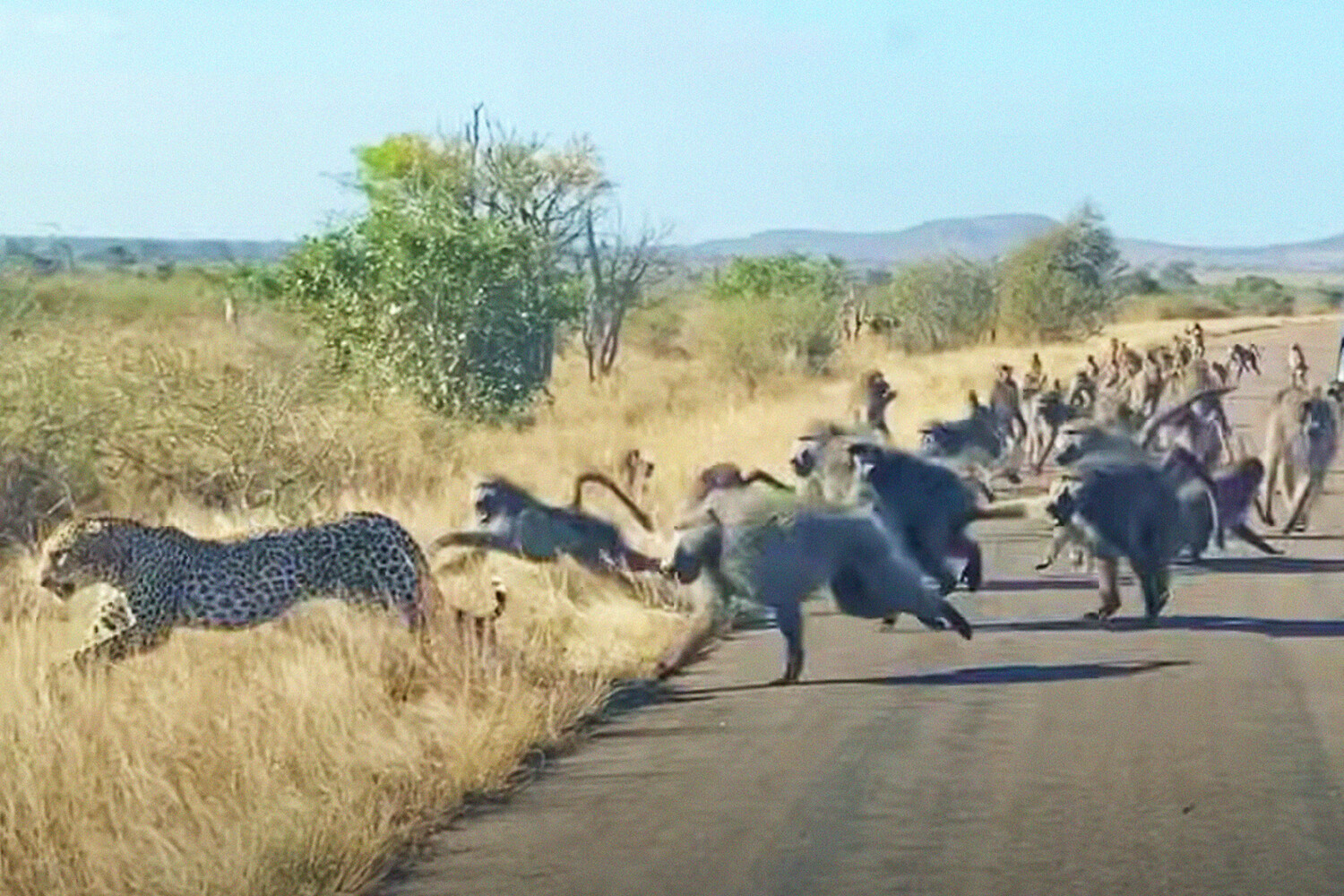 Женщина объяснила, что леопард, судя по всему, вышел на охоту, но не смог справиться со стаей обезьян. После того как хищник бросился на свою цель, его атаковали десятки приматов. Потасовка между животными происходила прямо на проезжей части, поэтому водителям пришлось остановиться.