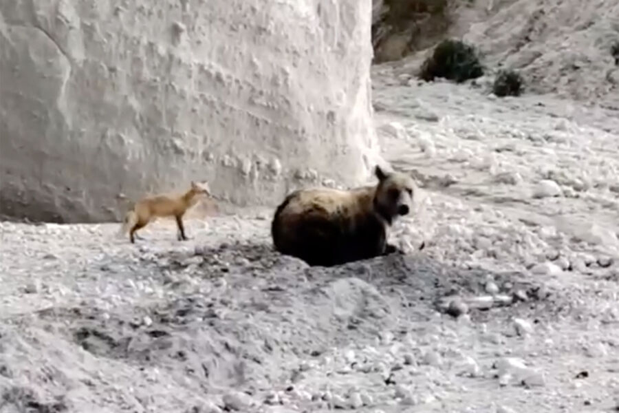 На острове Итуруп (Курильские острова) туристы сняли на видео, как лиса пристает к медведю, откапывающем на пляже заначку. Запись опубликовал Telegram-канал «ОстроВау! Сахалин и Курилы».