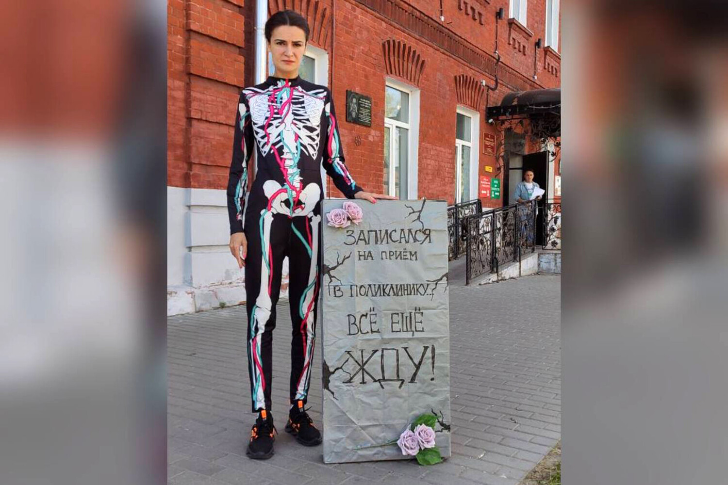 Россиянка протестовала против длинных очередей на запись к врачам в костюме скeлeта