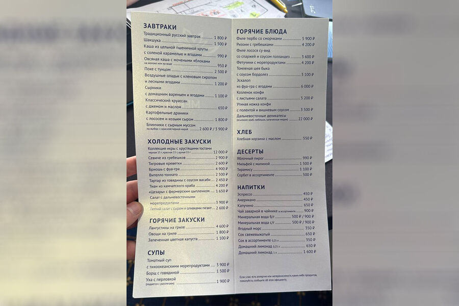 В списке горячих блюд — «Лангустины на гриле» за 4,6 тыс. рублей, «Томатный суп с тихоокеанскими морепродуктами» за 3,9 тыс. рублей и «Уха с перловкой», стоимостью 1,9 тыс. рублей.