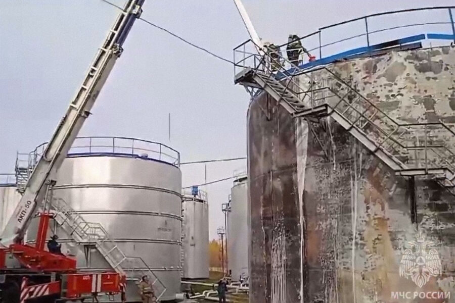 По предварительным данным, нефтяной резервуар пустой, его объем составляет 700 кубометров. На момент пожара на смене находились 15 человек, они эвакуируются на безопасное расстояние.
