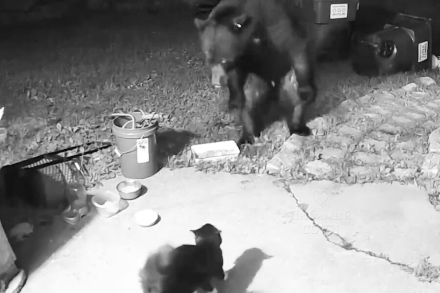 Инцидент произошел на одном из частных подворий в Красной Поляне и попал на записи камер видеонаблюдения, установленных на крыльце дома. Медведь пробрался на участок ночью, отпор ему дал домашний кот.