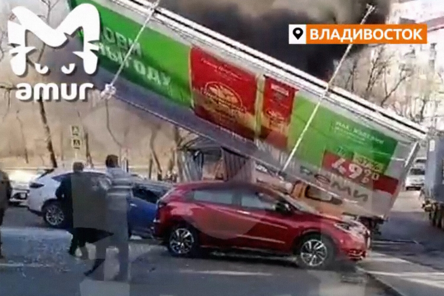 Инцидент произошел на улице Калинина. Крупная машина влетела в остановку и рекламный щит. В результате конструкция упала на несколько автомобилей. После этого очевидцы обратили внимание на дым, который выходил из фуры.