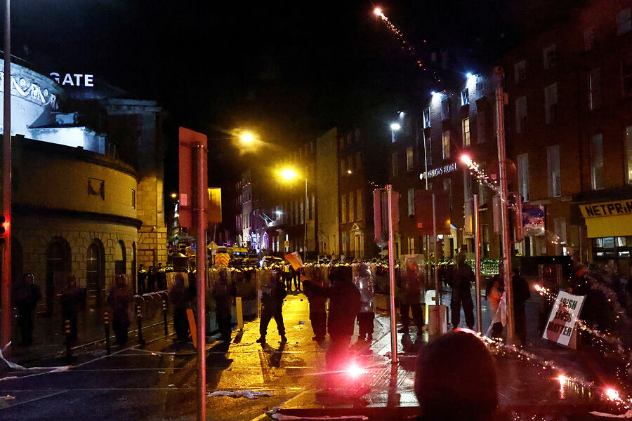 В связи с начавшимися беспорядками в Дублине силовые структуры перекрыли центр города. Столкновения полиции и спецназа с протестующими начались после нападения неизвестного с ножом на детей рядом со школой. Митингующие проявляют агрессивное поведение, пытаясь атаковать полицейских. Они поджигают патрульные машины и запускают сигнальные ракеты и фейерверки в сторону полицейских.