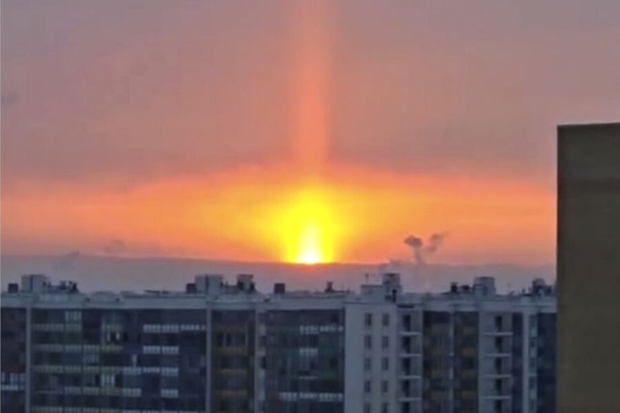 По словам местных жителей, на фоне облачного неба проступила ярко-красная вертикальная полоса света. Лучше всего удалось разглядеть оптический эффект жителям проспекта Непокоренных и улицы Турку, говорится в посте.