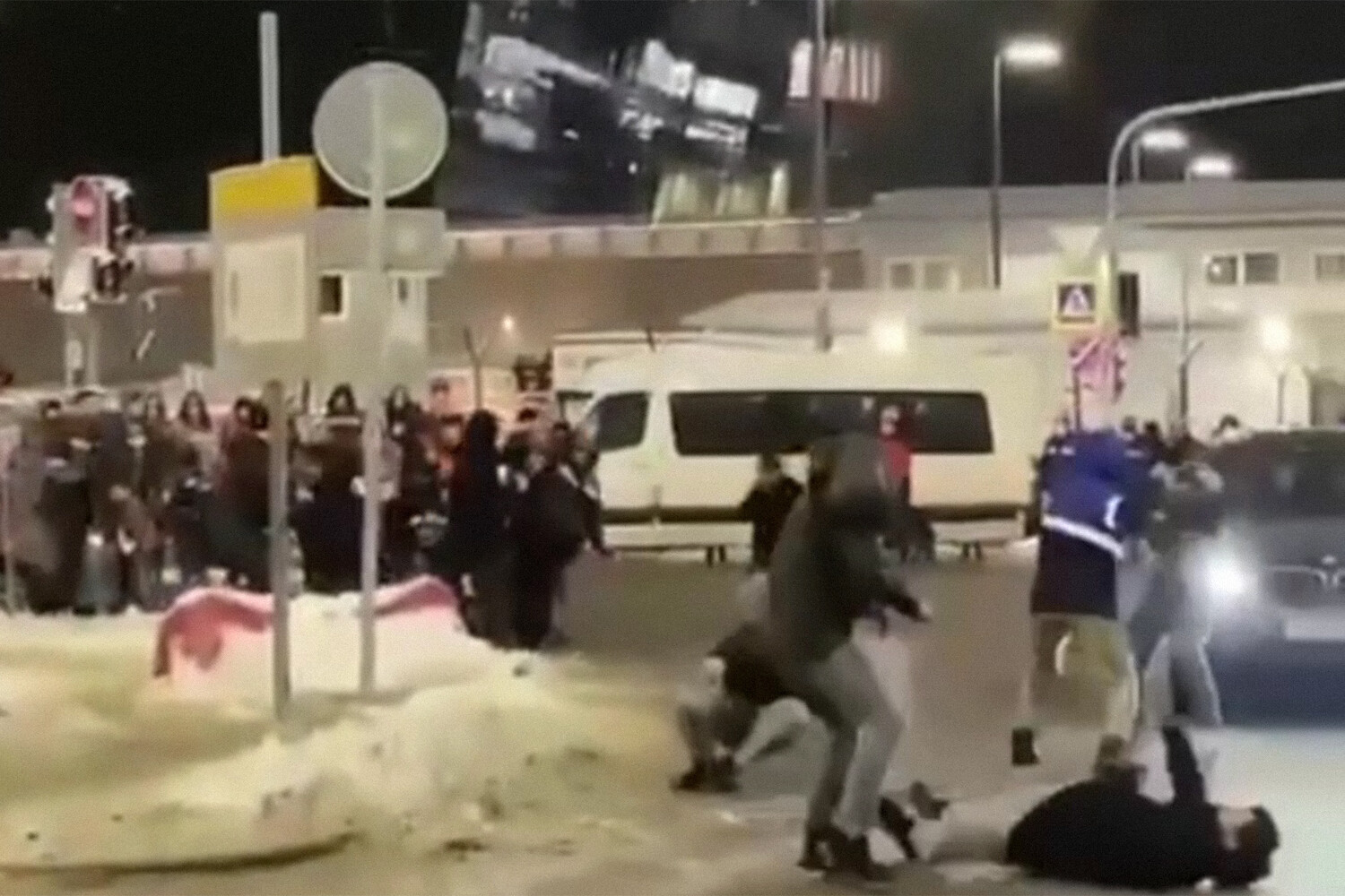 Инцидент произошел в Приморском районе. На кадрах с места происшествия заметно, как рабочие в спецформе со светоотражателями наносят удары друг другу и людям в обычной теплой одежде.