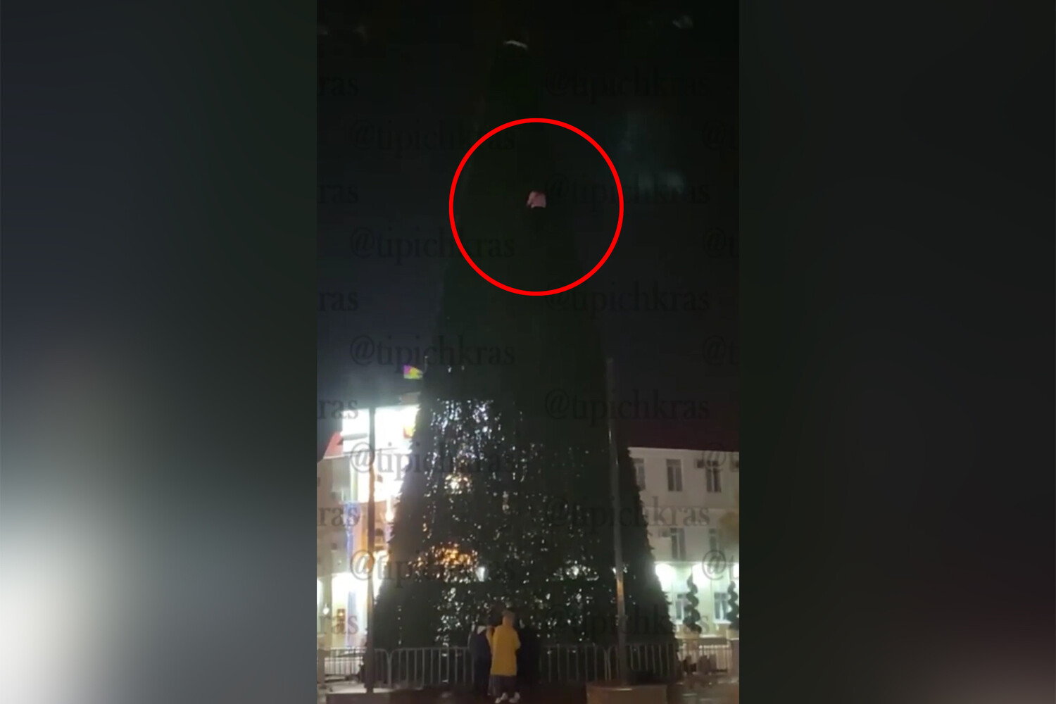 В Геленджике пьяная женщина забралась на праздничную ель и попала на видео. Его опубликовал Telegram-канал »Краснодар | Телетайп».