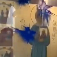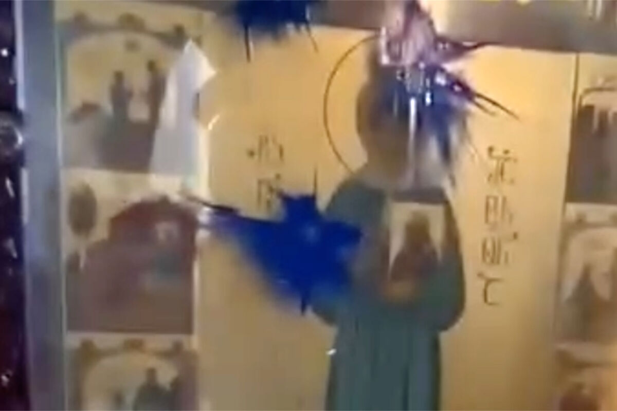 Гражданская активистка Ната Перадзе опубликовала в Facebook (владелец компания Meta признана в России экстремистской и запрещена) видео с иконой «Матроны Московской» из храма Цминда Самеба (Собор Святой Троицы) в Тбилиси, клеймо которой изображает сцену с Иосифом Сталиным. На кадрах видно, что защитное стекло иконы облито синей краской.