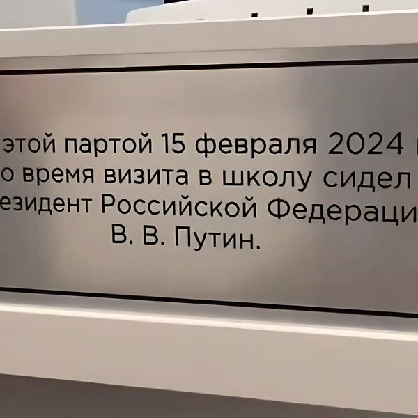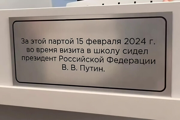 Табличка появилась на одной из парт в кабинете физики школы №32 Нижнего Тагила. Ее установкой руководство образовательного учреждения решило увековечить визит главы государства в город в феврале 2024 года. 12 апреля отремонтированную школу, которую успел двумя месяцами ранее осмотреть президент, показали депутатам законодательного собрания Свердловской области.