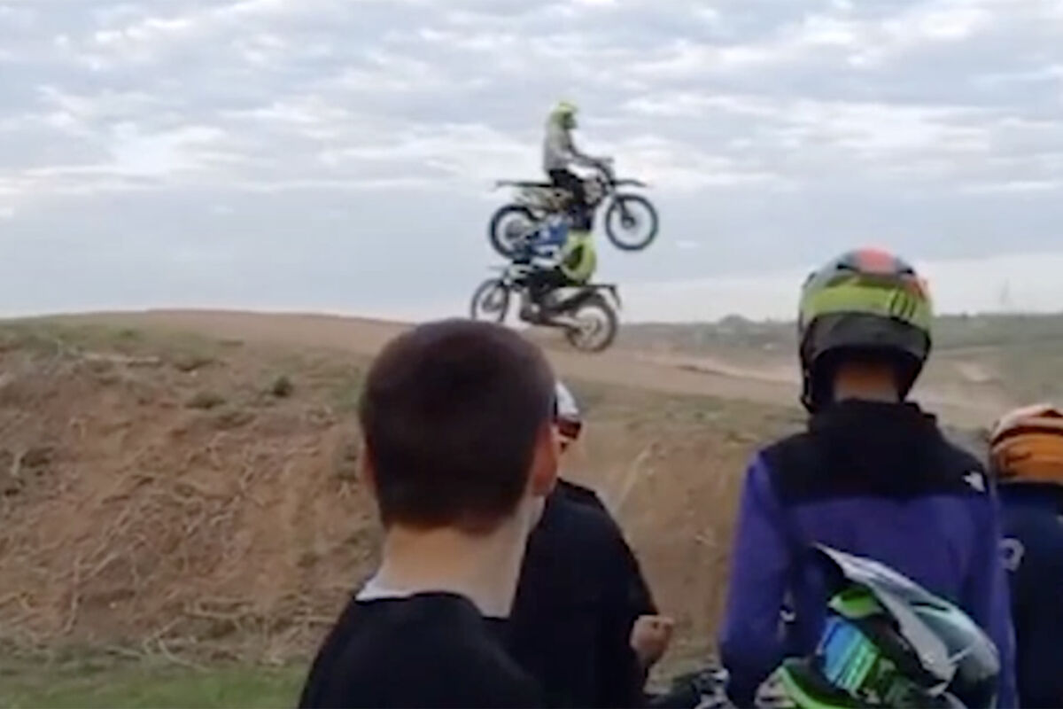 Инцидент произошел под Новошахтинском. По данным источника, столкнулись два мотокроссера. На кадрах с места инцидента видно, как один из участников поднялся в воздух и зацепил колесом голову другого водителя. В результате первый отлетел в сторону вместе со средством передвижения.
