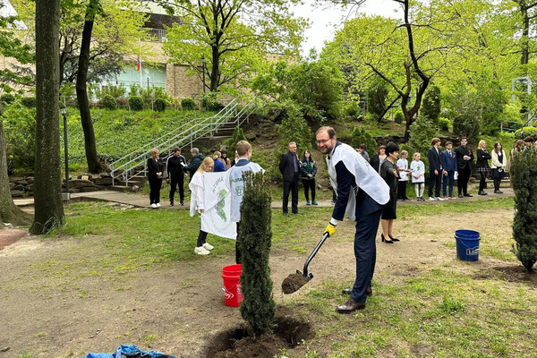 Учащиеся школы и сотрудники постпредства высадили саженцы тиса.