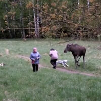 Инцидент произошел во время прогулки двух женщин, москвички шли по парку с собаками, животные бегали вокруг хозяек без поводков. К ним неожиданно вышел лось, животное начало нападать на женщин, лось пытался бить их копытами и не давал скрыться.