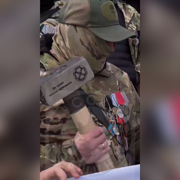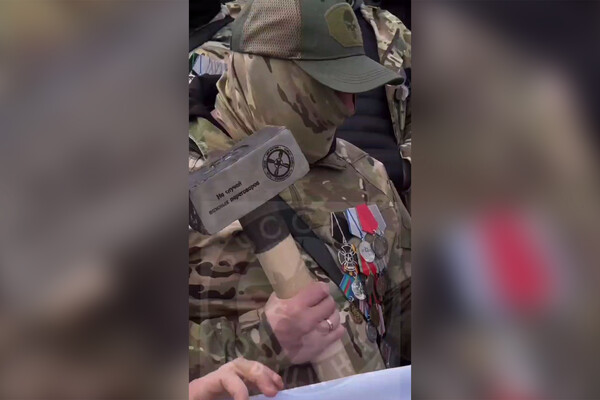 На кадрах группа вагнеровцев собралась у памятника генералу Михаилу Скобелеву. Их лица скрыты масками, на груди видны боевые награды. Один из мужчин держит в руках кувалду.