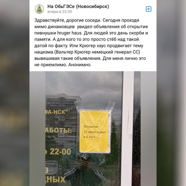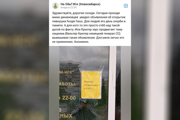 Объявление с текстом «Открытие 22 июня ровно в 4 часа…» появилось на двери будущего пивного заведения в микрорайоне «ОбьГЭС». Его фото было опубликовано в районном сообществе. На ситуацию обратили внимание в «Союзе отцов и Семей».