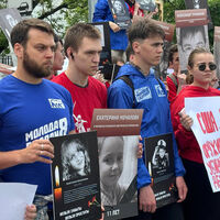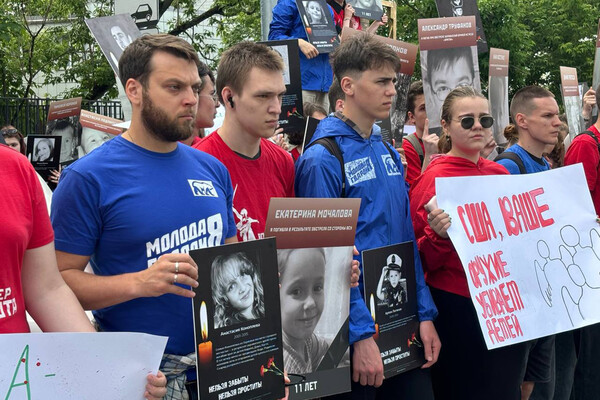 У посольства США молодогвардейцы установили траурный колокол, который прозвонил по числу детей ставших жертвами агрессии.