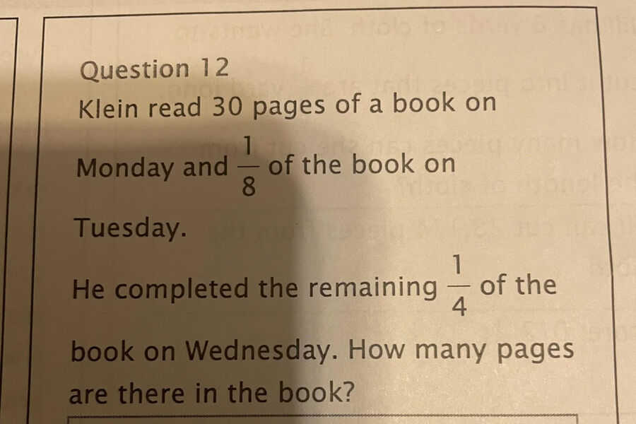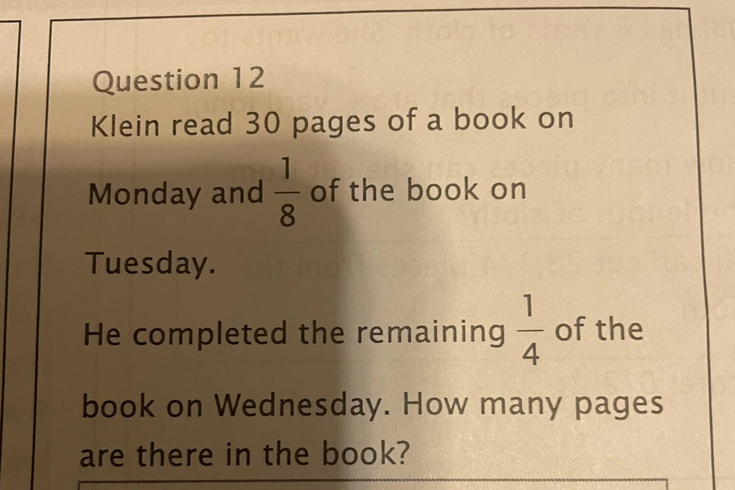 «Кляйн прочитал 30 страниц книги в понедельник и одну восьмую часть книги во вторник. В среду он дочитал оставшуюся одну четвертую часть. Сколько страниц в книге?» — таково было условие задачи.