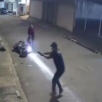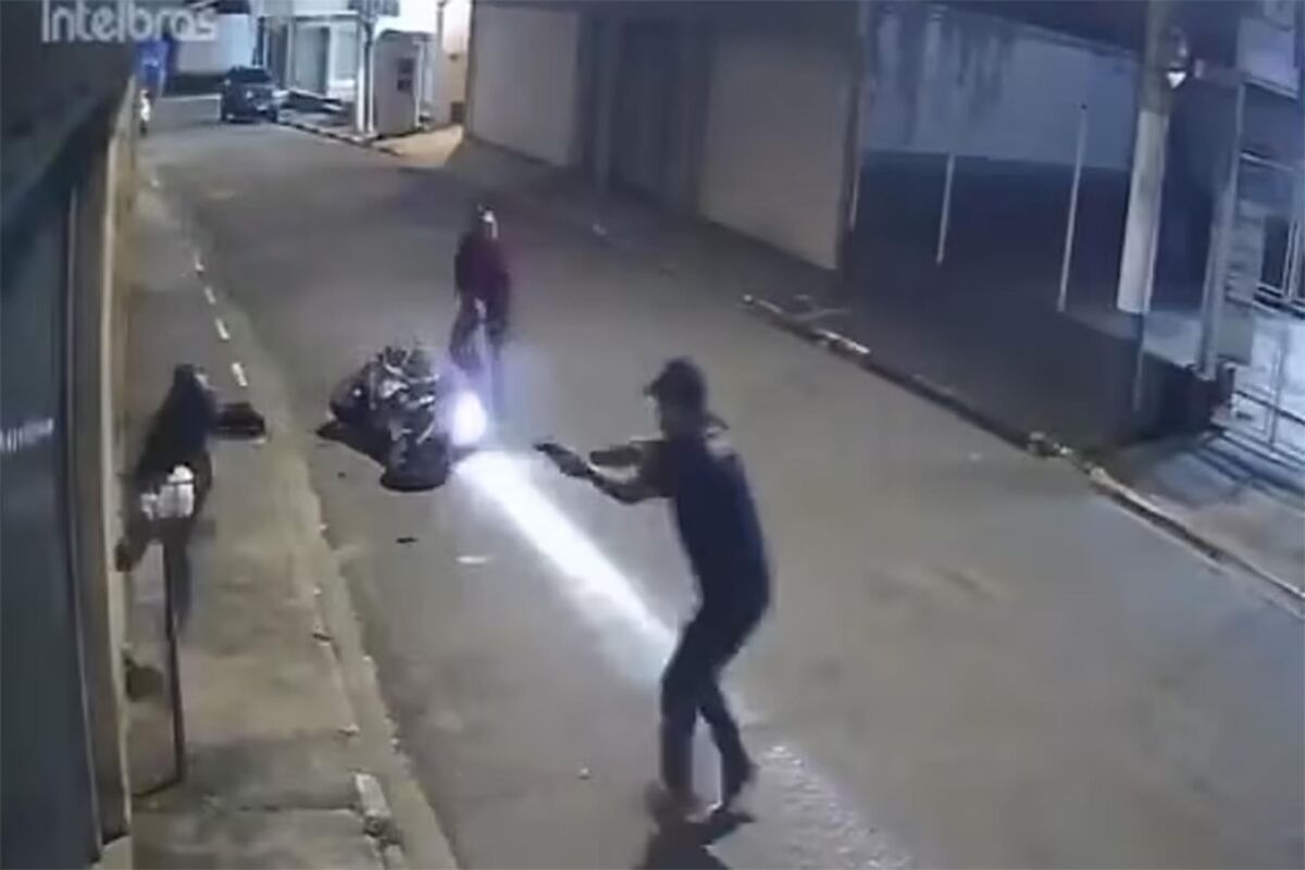 Инцидент, попавший на камеру видеонаблюдения, произошел вечером 4 августа в городе Гуарульюс на юго-востоке страны. На записи видно, как местный житель попрощался со своим знакомым и пошел в противоположном от него направлении. В этот момент двое молодых людей подъехали к мужчине на мотоцикле и затормозили.