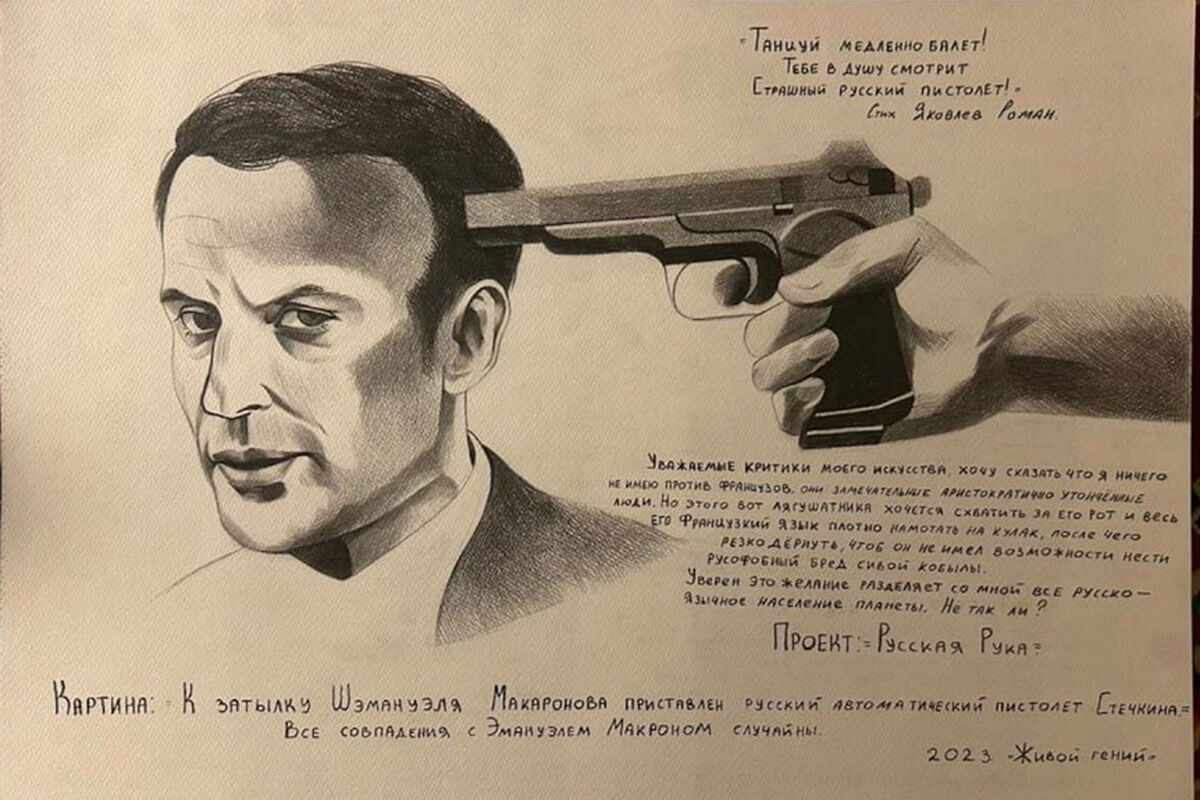 По данным Telegram-канала, карикатурист Роман Яковлев пришел в музей, чтобы прорекламировать собственное творчество. Вместе с другом он стал клеить на колонны картинки с изображением Джо Байдена, Джен Псаки, Эмманюэля Макрона и Олафа Шольца. К голове каждого политика художник пририсовал пистолет, а также дополнил работу стихами собственного сочинения.
