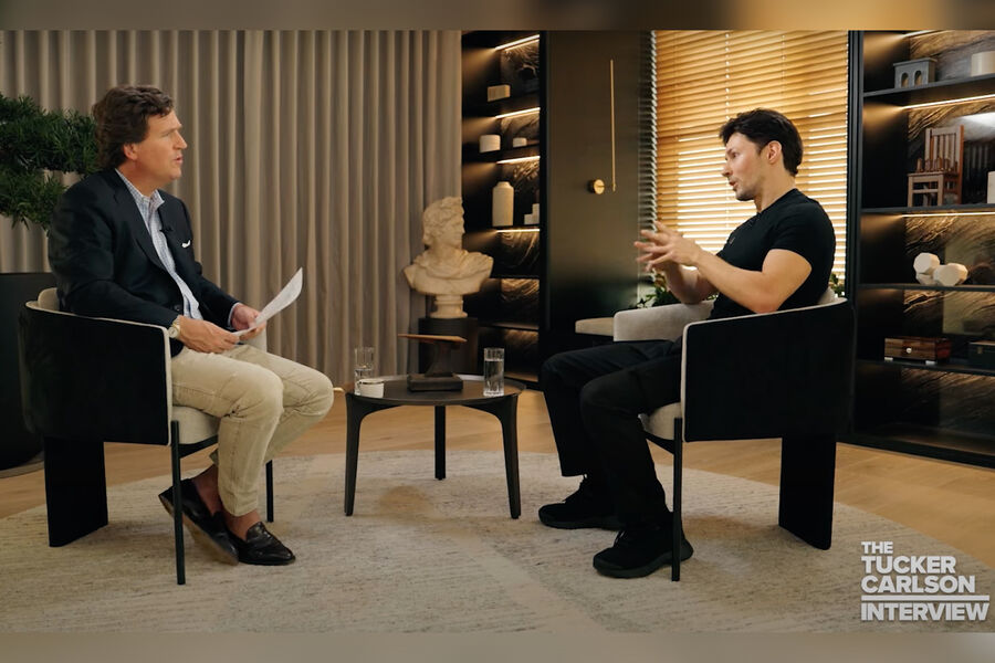 17 апреля Карлсон опубликовал интервью с Дуровым. Их встреча прошла в офисе Дурова в Дубае. Во время интервью бизнесмен заявил, что не верит в безопасность платформ, разработанных в США. Карлсон же отметил, что в Штатах шпионаж оправдывают безопасностью. Соучредитель Telegram также заявил о чрезмерном внимании, проявляемом ФБР и другими американскими службами безопасности.