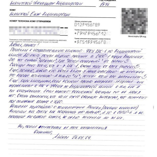 Она написала письмо из ИК-1 во Владимирской области, куда ее этапировали после недели в СИЗО-1 во Владимире. Баязитова сообщила, что написала прошение о помиловании на имя президента.