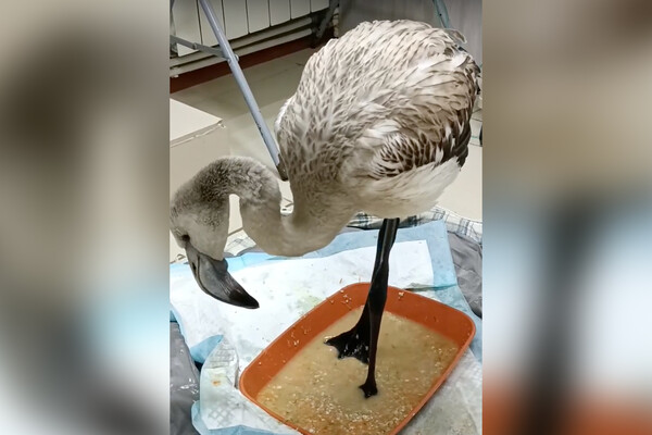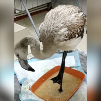 «Это птенец розового фламинго. Просто пока маленький и серенький. Перелом правого крыла, рана левого крыла, травма правой лапы, истощение. Малыш даже плохо держится на лапах. Прогнозы пока очень сомнительные», — поделились сотрудники центра 18 ноября.
