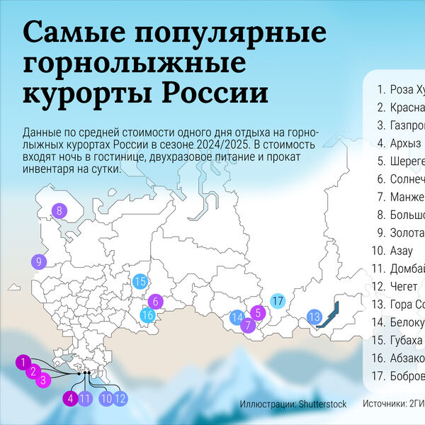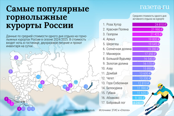 Наиболее бюджетные варианты российских горнолыжных курортов в этом сезоне — в Красноярском крае («Бобровый лог») и Башкортостане (Абзаково). Там день обойдется в 8,2 тыс. и 9,2 тыс. соответственно. А вот рейтинг самых дорогих вариантов возглавил Краснодарский край, где один день будет стоить в среднем 24,8 тыс. («Роза Хутор»), 22 тыс. («Красная поляна») и 21,4 тыс. («Газпром»). Также в список курортов, которые потребуют наиболее значительных бюджетов, вошли Архыз в Карачаево-Черкессии (19,8 тыс.) и Шерегеш в Кемеровской области (19,6 тыс.).